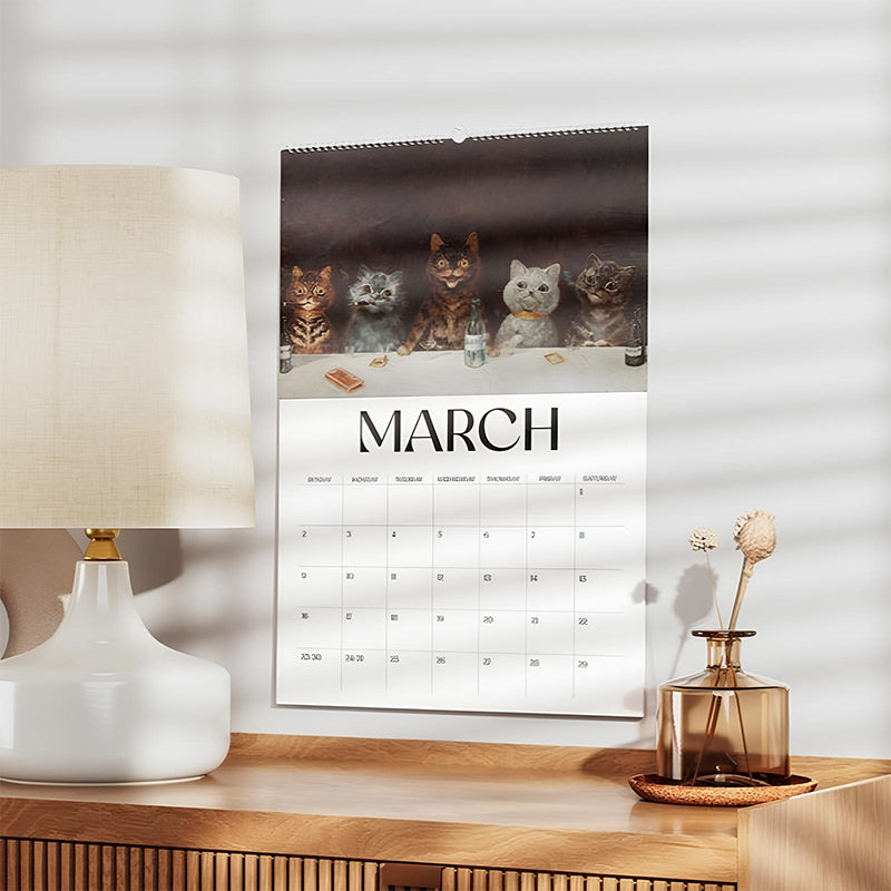 Fantastiske Illustrasjoner: Hver måned viser fortryllende kattekunst i en stil fra midten av forrige århundre som umiddelbart fanger oppmerksomheten. Disse stilige og moderne kattene fører deg inn i en fascinerende verden fra en sjarmerende og drømmeaktig tid.