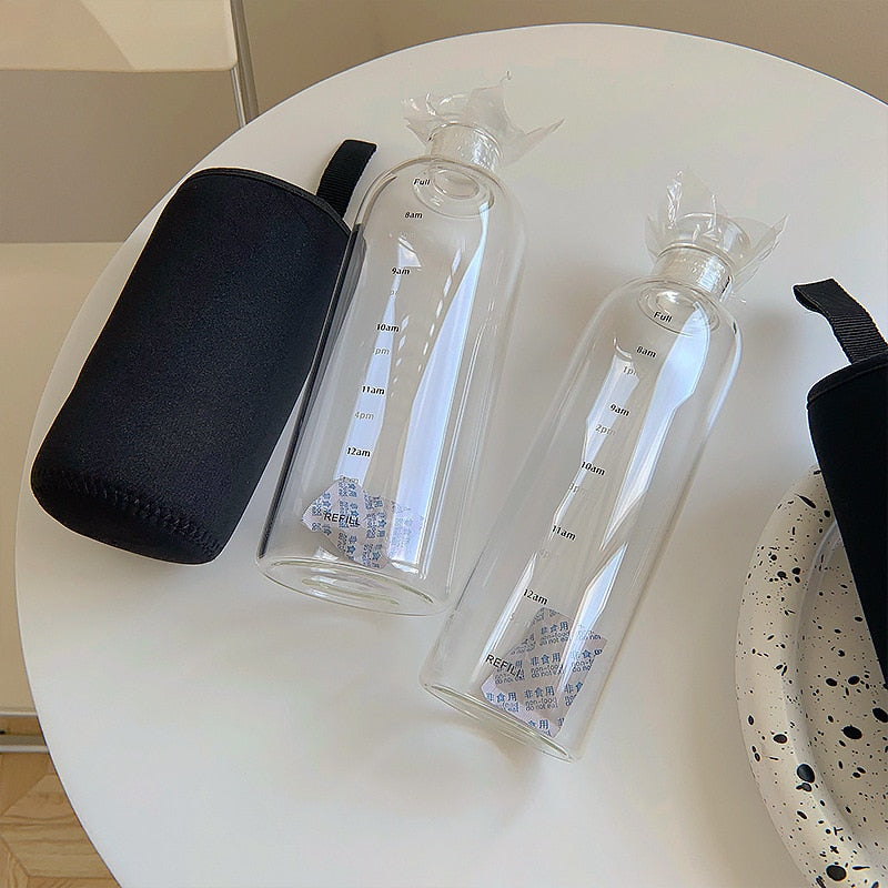 Keep track of your daily fluid intake with this stylish glass water bottle. It features a time indicator printed on the surface to help you achieve your hydration goals, and has a leak-proof lid that makes it easy to carry in your bag.