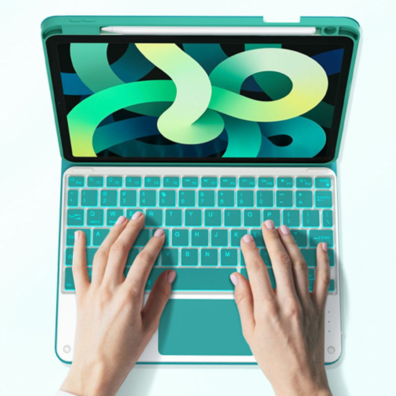 PU-lærdeksel: Dette tastaturet er innpakket i et stilfullt og slitesterkt PU-lærdeksel som ikke bare ser bra ut, men også beskytter iPaden din mot riper og skader. Det høykomprimerte materialet sikrer langvarig holdbarhet, noe som gjør det perfekt for daglig bruk.