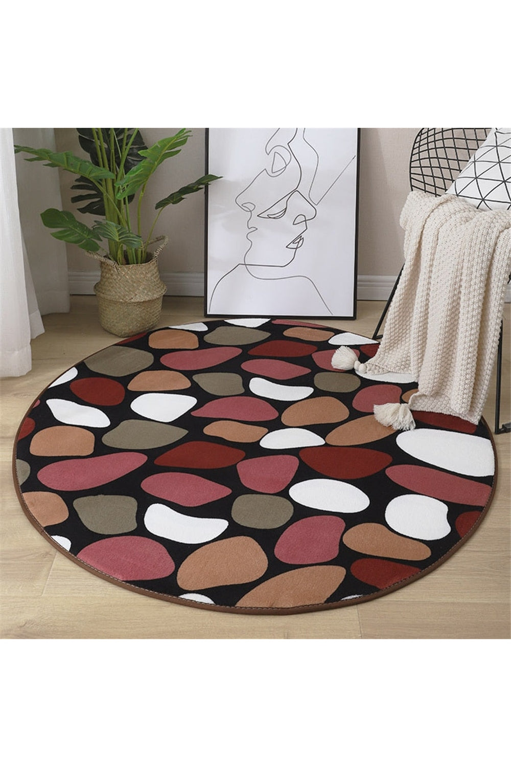 Rundt teppe med myk overflate og jevn struktur. Teppene har mønstre i lyse og mørke fargetoner. Formen er sirkulær og kantene er runde. Passer til bruk i stue, soverom eller barnerom.