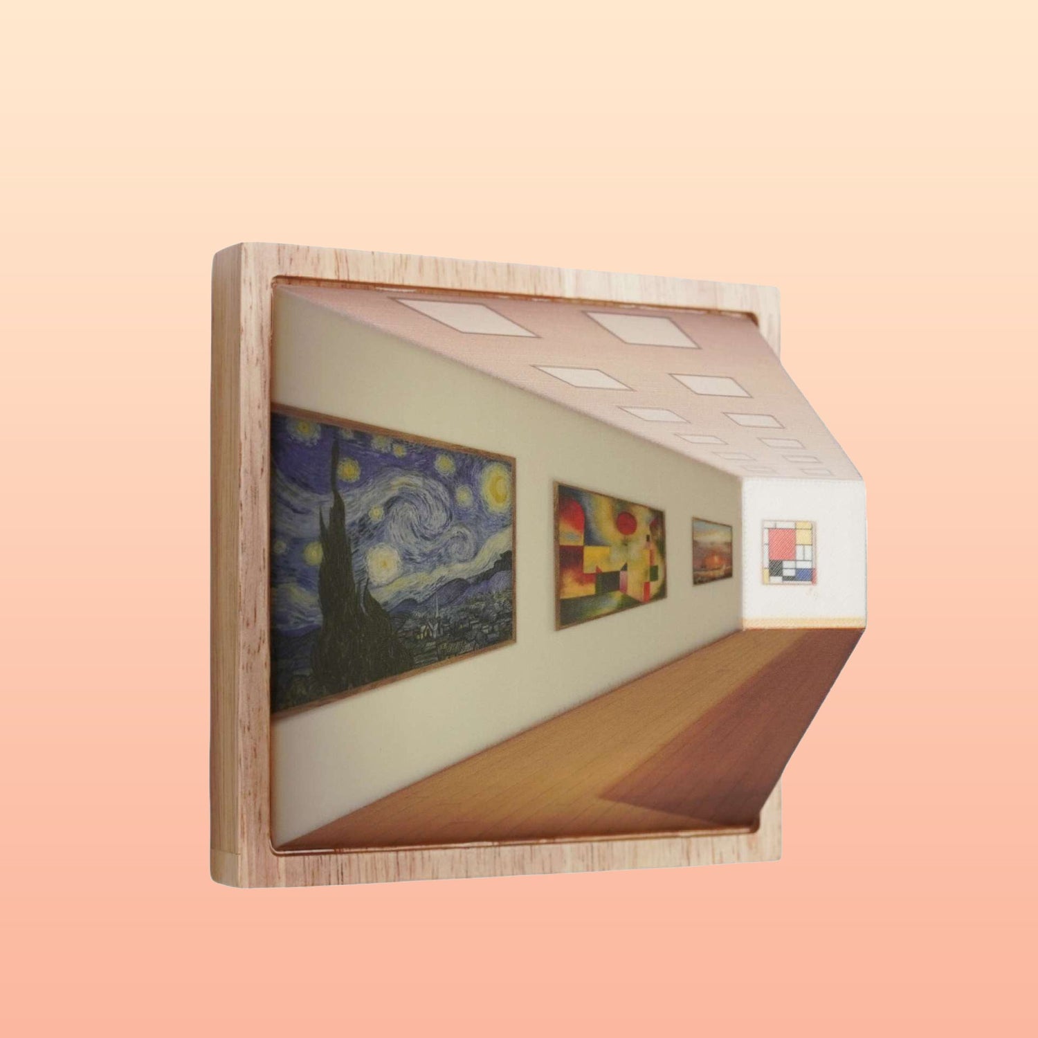 Mangfoldig Scenesalternativ: Velg mellom fire fortryllende innstillinger: sofistikasjonen av et kunstgalleri, roen ved havet, nostalgi fra et klasserom, eller intrigen i en gang.