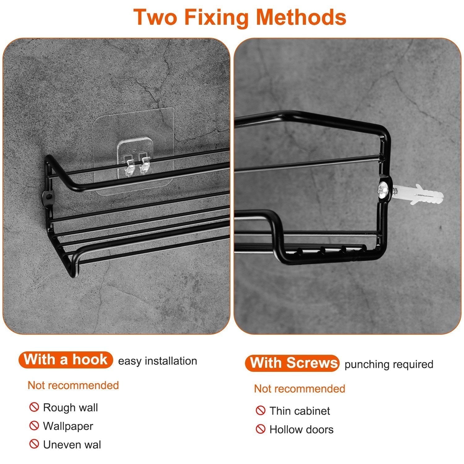 - Enkel montering: Velg mellom to alternativ for oppheng. Fest krokene til veggen for en enkel og stilren installasjon. For ekstra holdbarhet kan du bruke skruene til å feste hyllene. Disse passer til de fleste overflater, men det anbefales å unngå ujevne flater, tapet, tynne skapdører og hule dører.