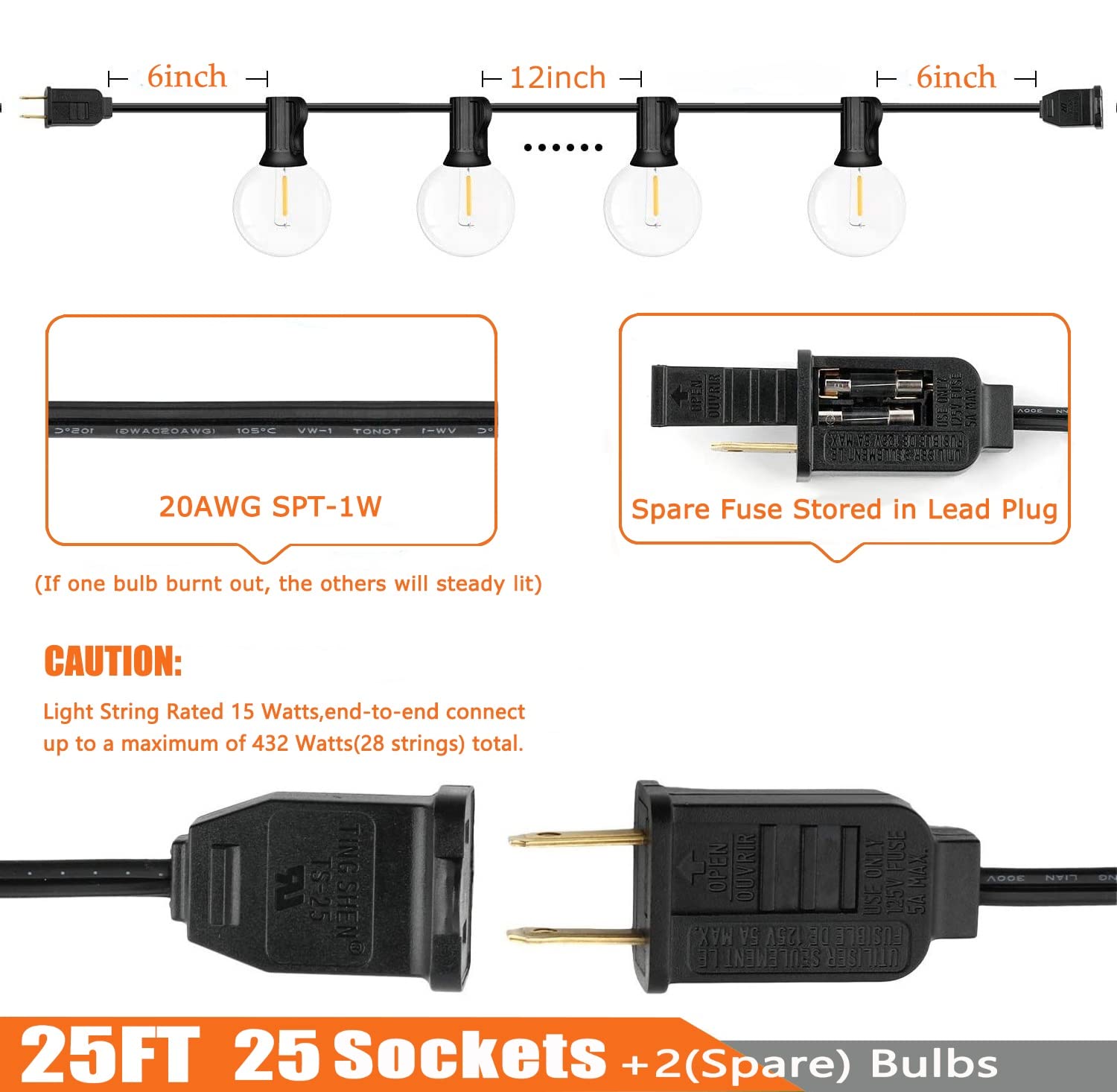 Hjemix | Abeja 25Ft Led Utendørs Lyskæde - G40 Globe, 25 Shatterproof Pærer, Vanntett Svart Ledning