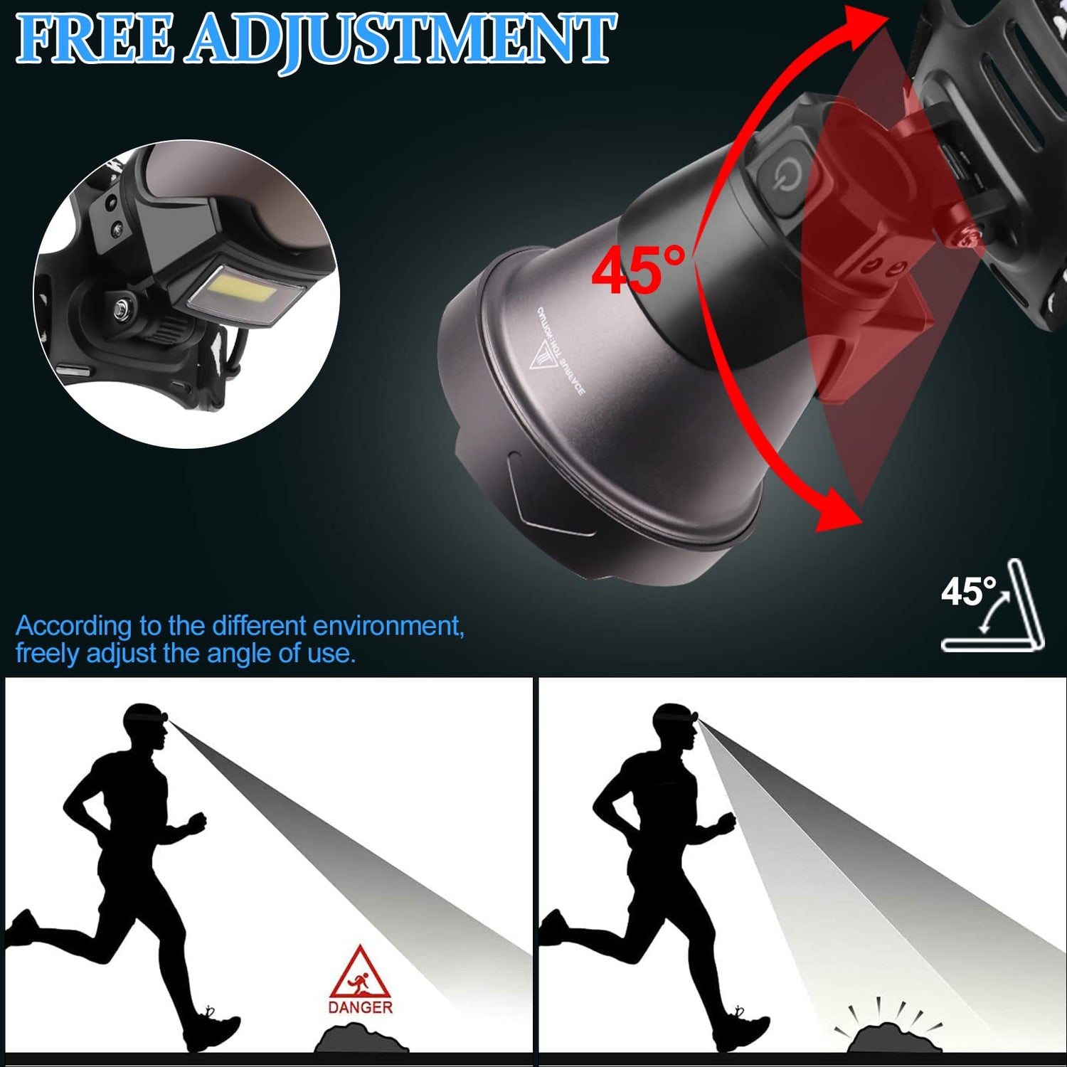 Justerbar 90° Tilt: Juster enkelt strålen til enhver vinkel med et 90° vippe-design, som gir håndfri lys for enhver oppgave, fra å fikse utstyr til å navigere i vanskelige stier.