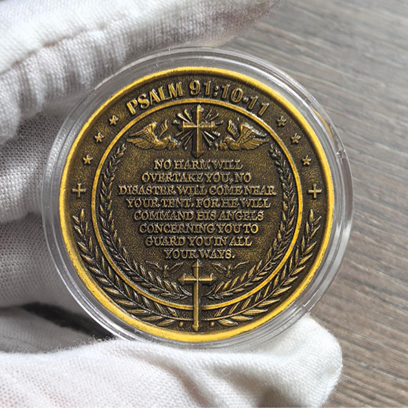 Denne vakkert utformede utfordringsmynten har et imponerende bilde av erkeengelen Mikael på forsiden, som representerer styrke og beskyttelse, mens baksiden bærer et sitat fra Salme 91:10-11, som formidler et budskap om tro og håp.