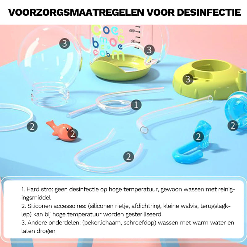Easy to Clean - The rigid straw cannot be sterilized at high temperatures, but can be easily cleaned with a cleaning agent. The silicone components (silicone straw, seal, small whale and one-way flap) can withstand high temperatures for sterilization. Other parts (bubble dome, cup body) can be washed with warm water and dried.