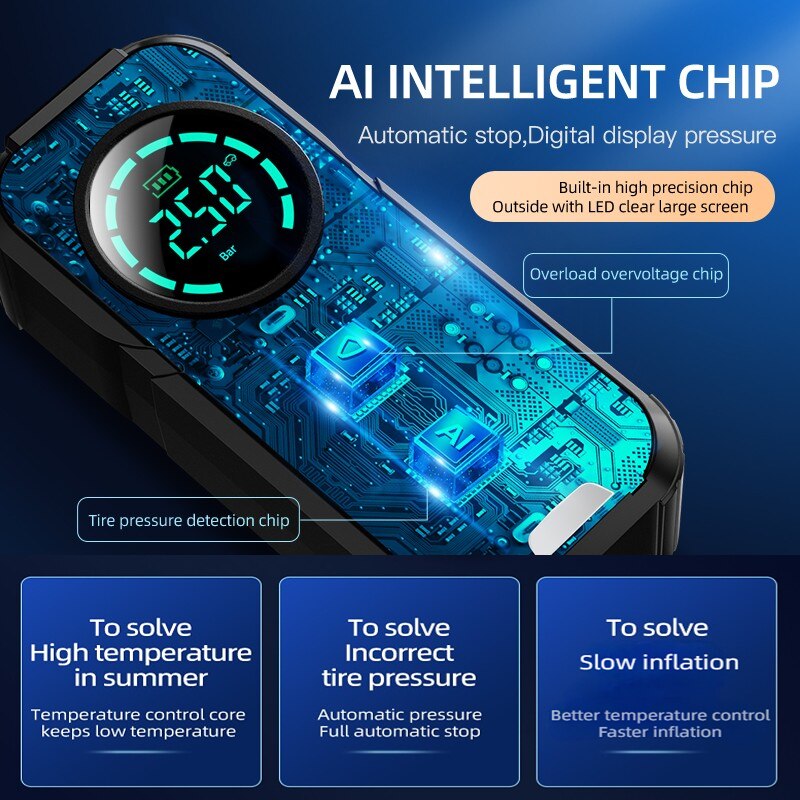 • Kompatibel med en rekke dekktyper: biler, sykler, motorsykler, bobiler, SUV-er, ATV-er, oppblåsbare båter, sportsutstyr og andre oppblåsbare gjenstander. Tre ekstra dyser og adaptere er inkludert for økt allsidighet.