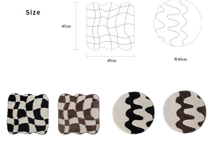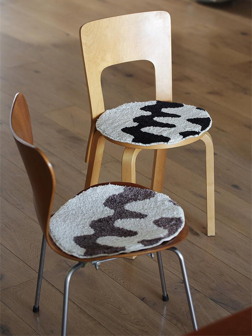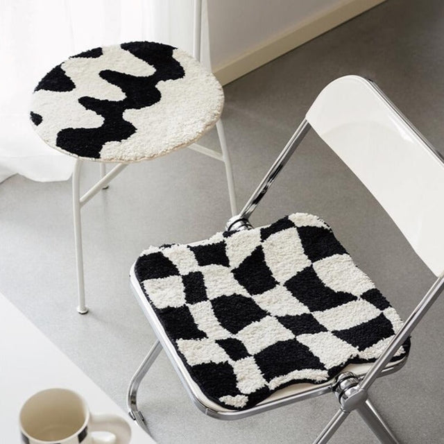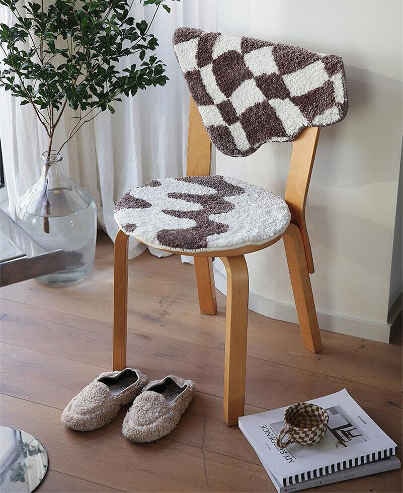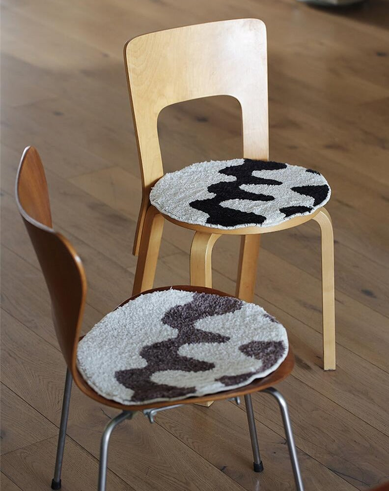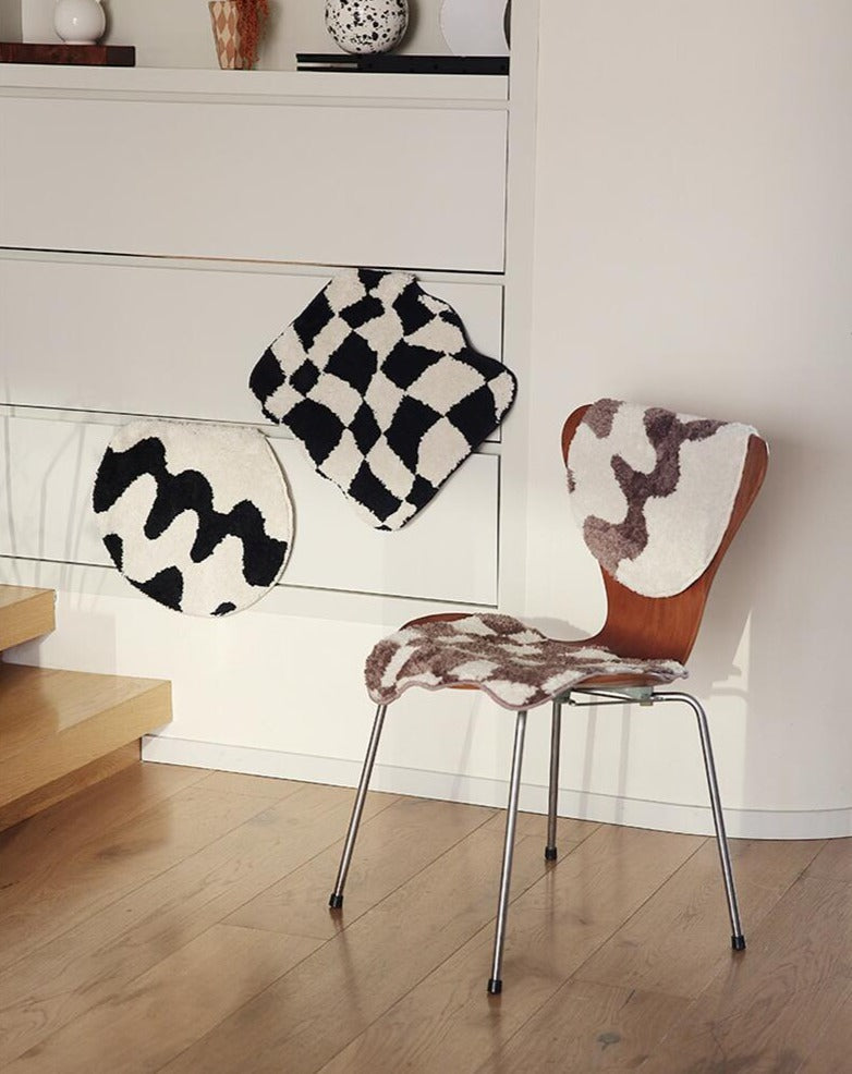 Behagelige puter med bølgete mønster og stripete design, ideelle for kontorstoler eller spisebord.