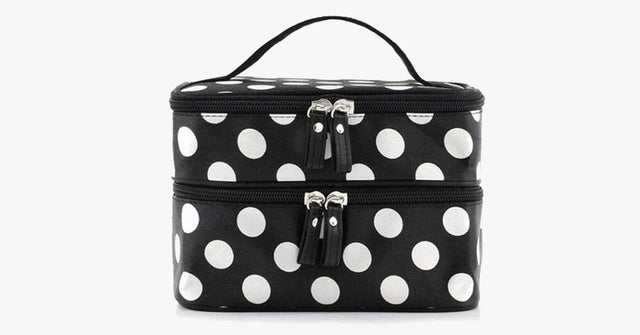 - Denne sminkeposen med prikkete design har et delikat utseende og kommer med to glidelåser for å holde kosmetikk og nødvendigheter pent ordnet