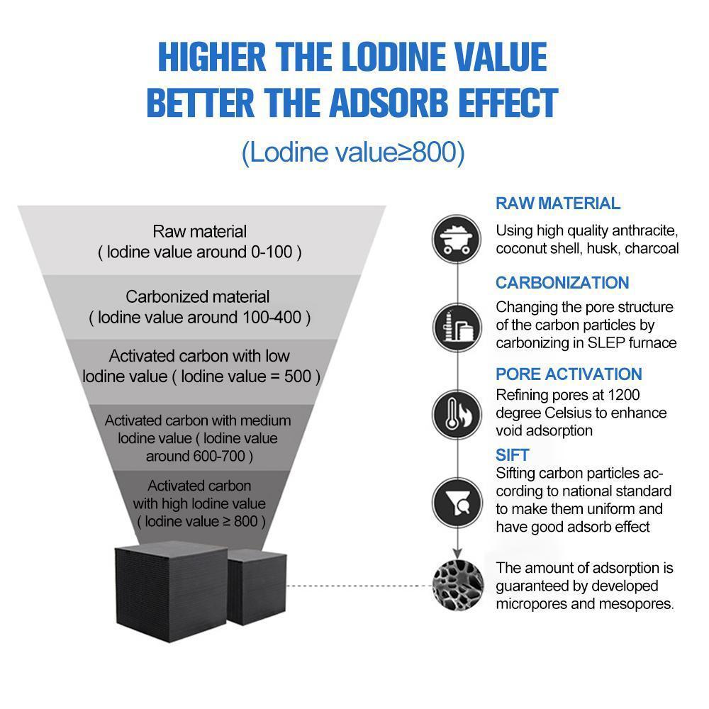 Høyere jodnivå tilsvarer bedre effektivitet ved adsorpsjon.