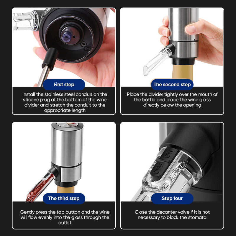 [One-Touch Rødvinslufting]: Denne enheten har en praktisk av/på-knapp som sikrer nøyaktig helling av vin uten å søle. Den spesialdesignede, koniske tuten forhindrer dråper fra å treffe dukene. Denne elektriske karaffelen håndterer effektivt de vanligste problemene med overfylling ved tradisjonell rødvinservering.