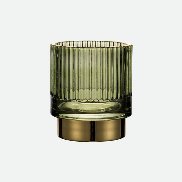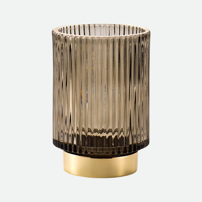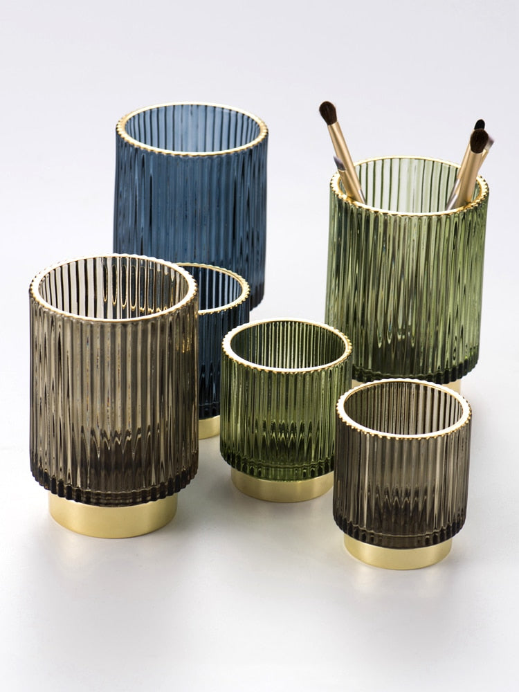 Utforsk skjønnheten i et velorganisert rom. Vår Elise Gold Foil Glass Makeup Holder & Organizer bidrar til at kosmetikk og sminkebørster forblir pent ordnet. Disse stilige glassorganisatorene, dekorert med gullfolie, gir en elegant måte å håndtere sminken, hårverktøyene og andre nødvendigheter på. Uansett om du ønsker å oppbevare tannbørsten og tannkremen på badet, eller ha hårtilbehør lett tilgjengelig på soverommet, er dette det perfekte valget for deg. Laget av kvalitets borosilikatglass med en teksturert overflate, er vår Elise Gold Foil Glass Makeup Holder & Organizer tilgjengelig i tiltalende farger som grønn, brun og blå. Hver holder har en krommetallfinish og er elegant utstyrt med stilige gullfolie detaljer på toppen. Den større modellen kan romme mer substansielle gjenstander, mens de mindre versjonene er ideelle for små tilbehør som hårnåler eller bomullspads. Plasser disse på sminkebordet, benkeplaten på badet eller skrivebordet for å organisere ting som saks og penner. Bruk flere organisere sammen for en imponerende fremvisning på sminkebordet eller arbeidsområdet.