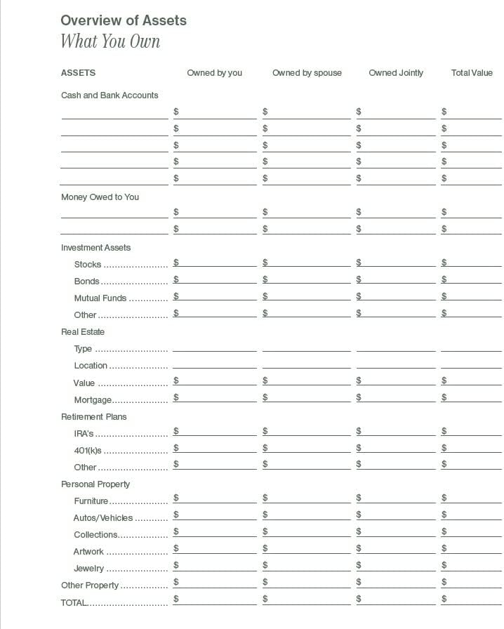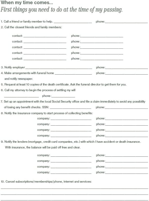 - Denne planleggeren omfatter seksjoner for nødvendig informasjon som personlige beskjeder til familien, plassering av viktige dokumenter, informasjon om nett-kontoer, essensielle kontakter, forsikringsdetaljer, familiens helsetilstand, retningslinjer vedrørende medisinsk behandling og juridiske dokumenter, preferanser for eiendeler, en oversikt over eiendeler og forpliktelser, bankinformasjon, investeringer, eiendommer, biler, framtidige ytelser, valg angående begravelse eller kremasjon, samt oppgaver som må håndteres etter min død.