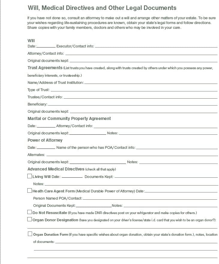 - Systematiser hvor viktige finansielle og juridiske dokumenter er lagret, sett opp en liste over helsepersonell og viktige kontakter samt nødvendige oppgaver som må gjennomføres etter din bortgang.