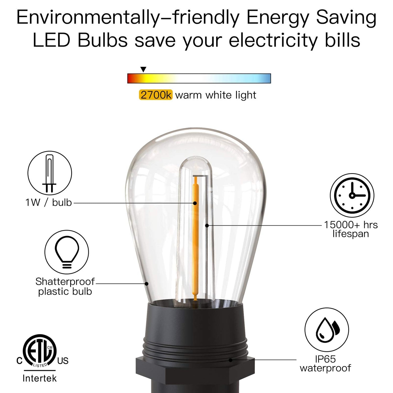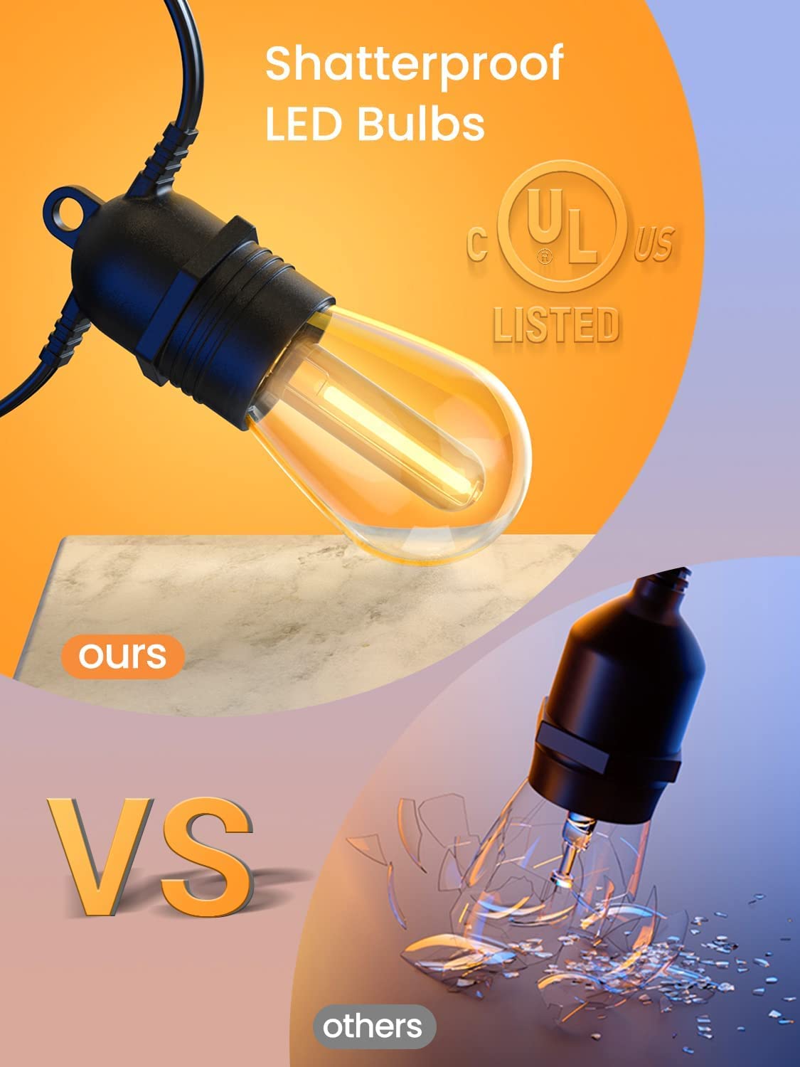 - ❤️️【Koble sammen utendørslys for enkel montering】Disse lysene leveres med 15 forhåndsinstallerte opphengsløkker på soklene, og vi inkluderer 16 kabelbinder for en problemfri installasjon, slik at du kan koble sammen opp til 25 tråder i serie for storslått dekorasjon! En 1,5 m forlengelseskabel er også med i pakken, som gir deg ekstra fleksibilitet fra stikkontakter. Ønsker du å forbedre din utendørs middagsopplevelse? Disse patio-lysene er den ideelle løsningen!