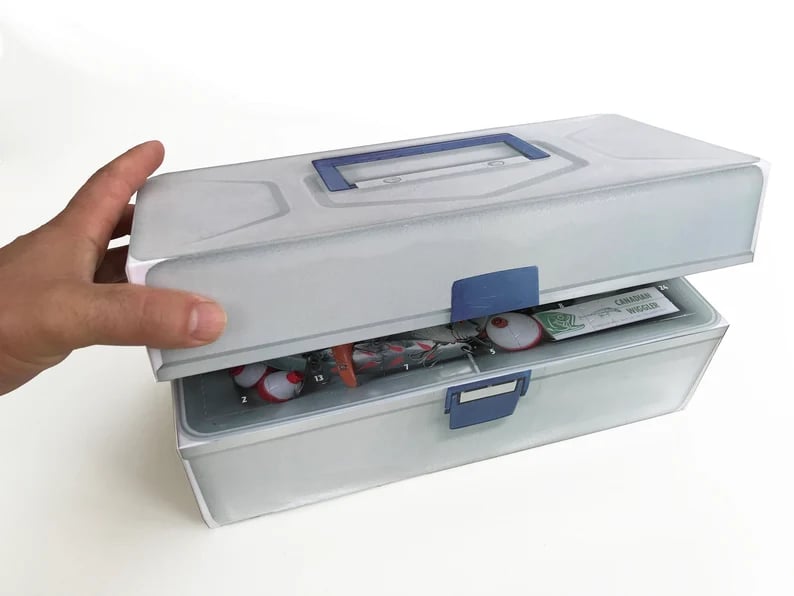 Inne i vil du finne en vakker, kompakt, vannavvisende boks under dør #1. De 23 rommene som følger avslører alle slags fantastiske fiskeutstyr av høy kvalitet for å fylle boksen.