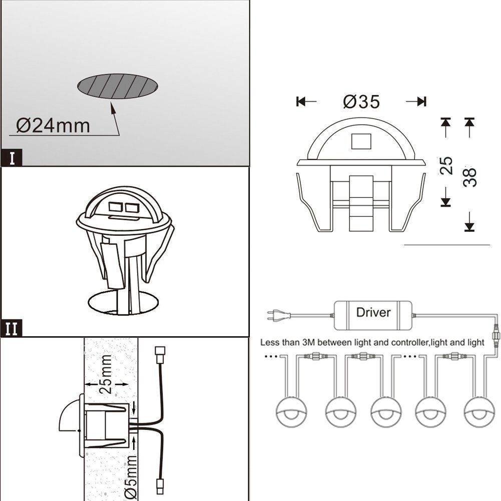 - Denne belysningen har kompakt størrelse F(diameter)35mm(1.38")*H25mm(0.98").