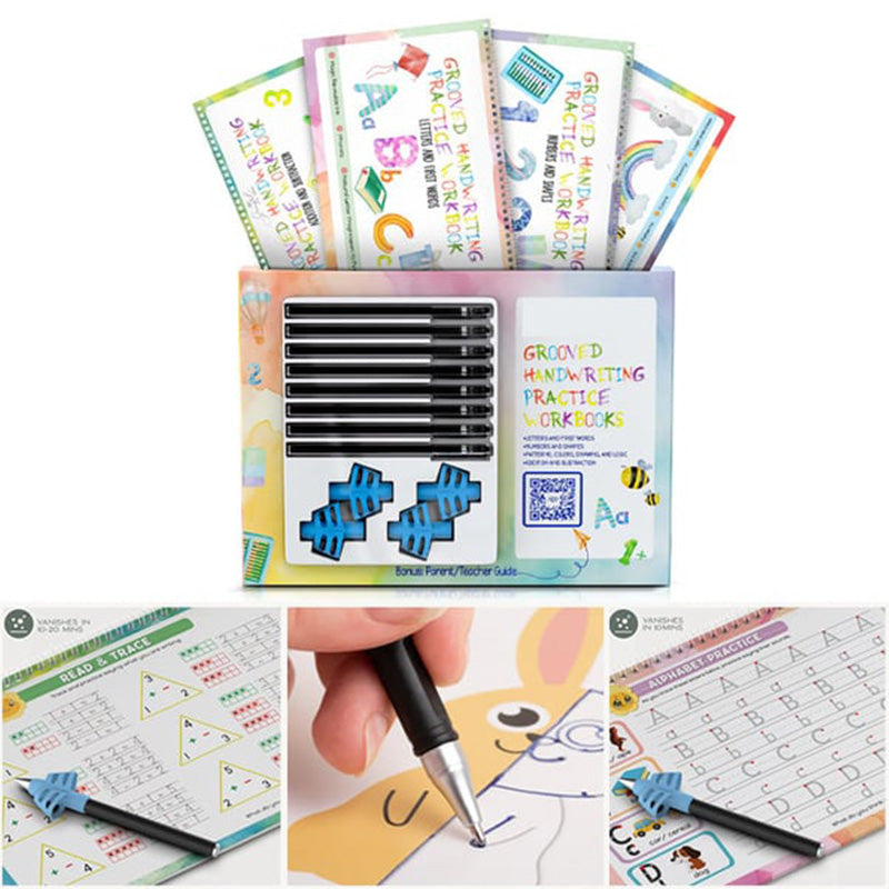 Magiske penner med utslettbart blekk: Settet inneholder 8 høykvalitets magiske penner med spesialblekk som gradvis forsvinner. Denne spennende funksjonen beriker læringsopplevelsen. Når barna sporer kantene, vil blekket sakte forsvinne, som gir muligheten til å repetere øvelsene på de samme arbeidsarkene.