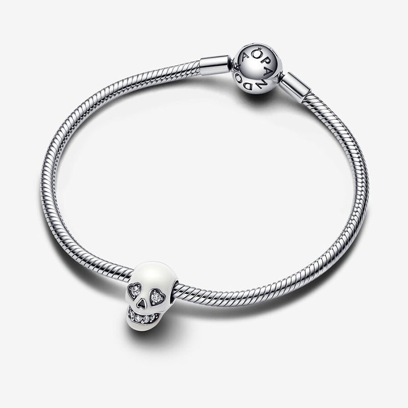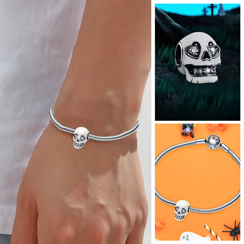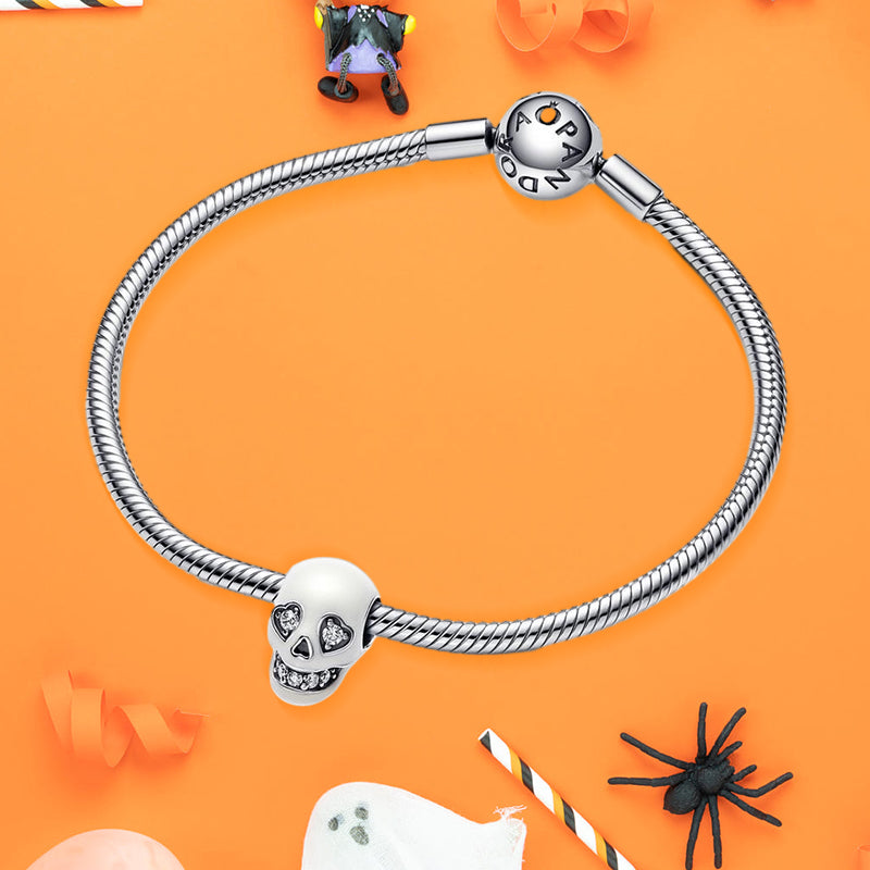 Lag et minneverdig inntrykk med den slående Spark Skull Charm. Denne charmen, laget av 925 sterlingsølv, har en hodeskalle-form med lysende emalje, med munn og hjerteformede øyne som skinner med klare zirkonia-stener.