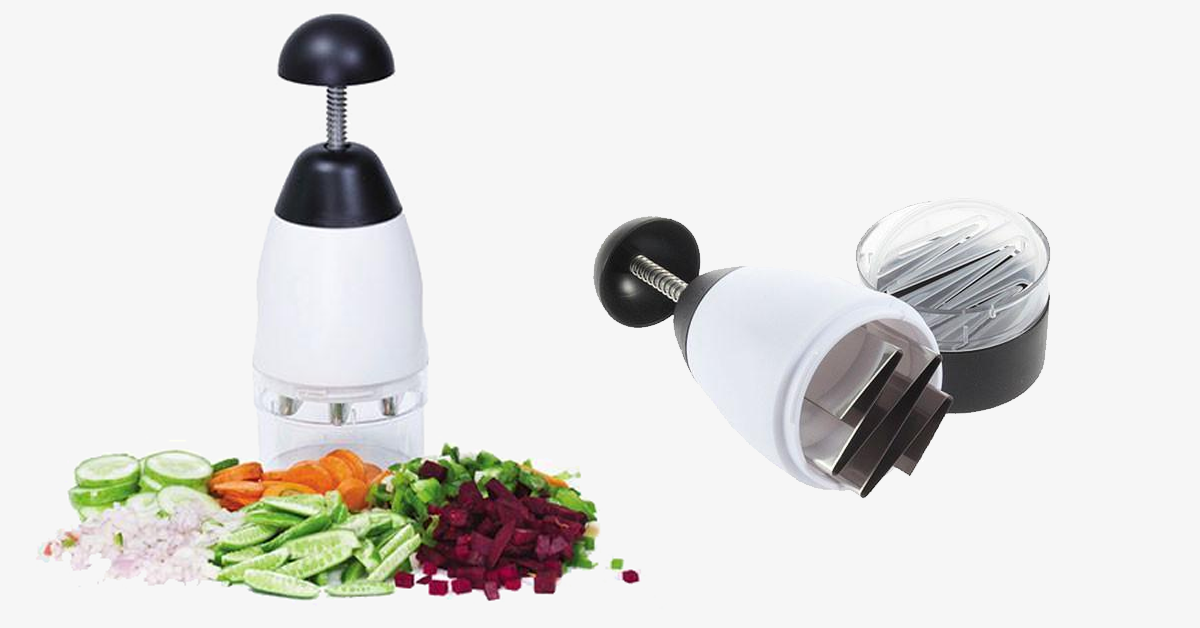 Frukt- og grønnsakskutteren tilbyr en effektiv og praktisk metode for å hakke, skjære og terne et variert utvalg av ingredienser som grønnsaker, frukter, tørket frukt og ost med bare ett enkelt trykk. Den er både raskere enn en vanlig kniv og mer brukervennlig enn en blender. Den lette designen lar deg plassere ingrediensene i den tilhørende basen eller direkte på et kutterbrett. Juster kutteren over maten og trykk ned på plunchen. De seks bladene vil raskt hakke ingrediensene dine, og med litt mer trykk kan du oppnå en enda jevnere tekstur! Dette verktøyet fungerer utmerket med alle typer matvarer, enten de er myke eller harde, tykke eller tynne! Lag en deilig salat, forbered tilbehør til smakfulle desserter, eller knus is på sekunder! Denne kutteren er allsidig nok til å klare alt.