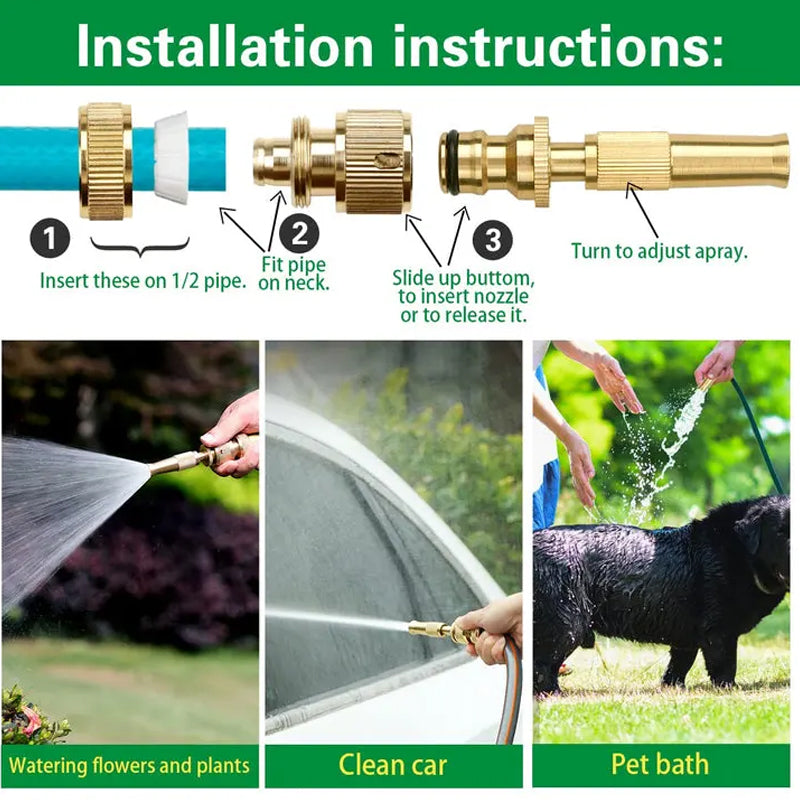 Robust og varig messing: Denne enheten er laget av høykvalitets messing som er både lekkasjesikker og holdbar. Hold deg unna skjøre materialer som plast eller aluminium. Den standard 3/4″ GHT slangeadapteren passer til alle typer hageslanger. Hurtigkoblingssettene gjør det problemfritt å feste kraner, slangeenden og dysene.