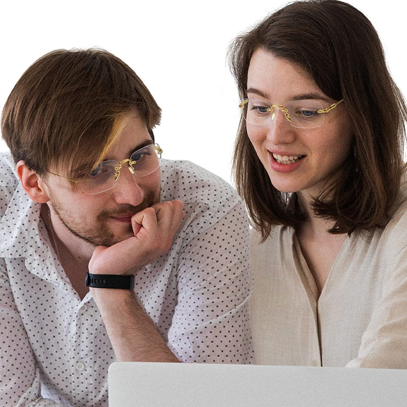 Vi presenterer våre herre- og damebriller uten ramme med anti-blålys for presbyopi, med et rammeløst design som gjør at du ser profesjonell og moderne ut mens du arbeider eller leser. Med vintage eleganse og et moteriktig design er disse brillene passende for enhver ansiktsform. Beskytt øynene dine mot skadelig blått lys samtidig som du holder deg stilig.