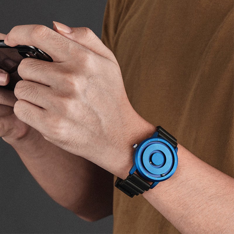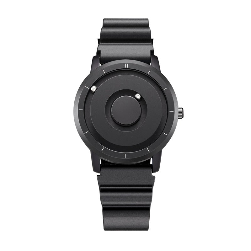 Revolusjonerende klokke: I motsetning til tradisjonelle klokker, vises tiden med en stål kule som er integrert i urskiven. Én kule viser minuttene og den andre viser timene. Oppdag tiden ved å berøre.