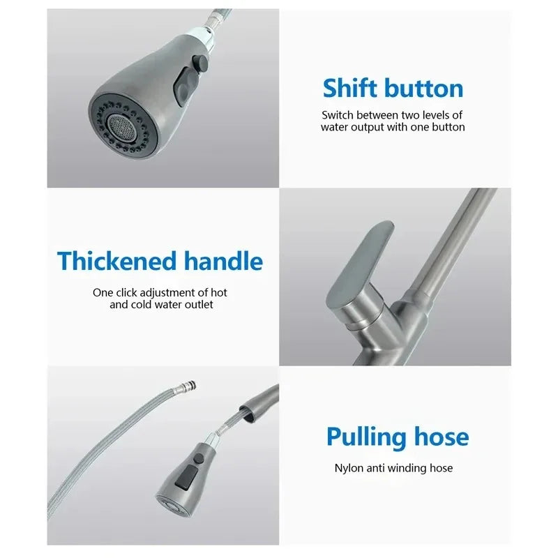 - Enkel å bruke:Dens uttrekkbare design sammen med enkel gasskontroll gjør det lett å justere vanntemperatur og -flyt, mens det fleksible sprøytehodet sørger for at du når alle områder av vasken for forskjellige rengjøringsoppgaver.