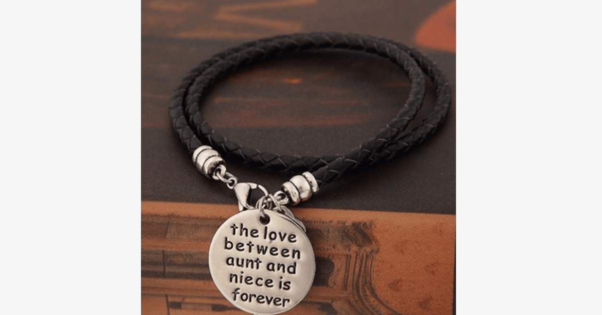 Ser du etter et armbånd med en spesiell betydning som skiller seg ut fra de vanlige alternativene? Vi introduserer det unike sammenflettede armbåndet med en gravert håndskrift og en rund charm, laget av vegansk lær og prydet med en sinklegering. Hver bokstav er nøye håndlaget, noe som gir det et unikt preg, sammen med sitatet "Kjærligheten mellom tante og niese er evig." Dette armbåndet kan justeres i størrelse og har en hummerlås samt et forlengelseskjede, noe som gjør det enkelt å tilpasse til håndleddet ditt. Skap oppmerksomhet med dette vakre, doble, justerbare lærarmbåndet!