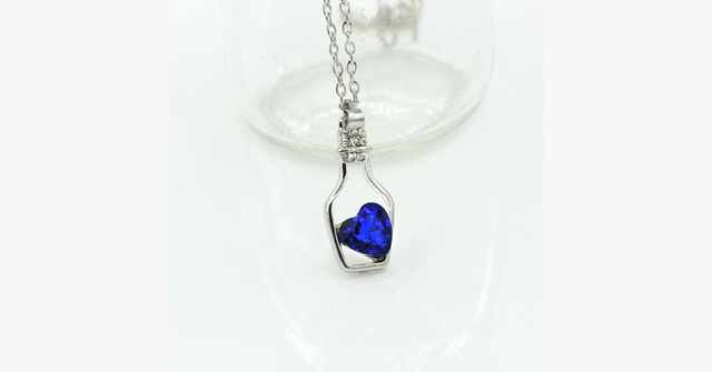 Har du noen gang sett deg selv i speilet etter å ha kledd deg og følt at noe manglet? Dette stilige halskjedet vil enkelt løfte antrekket ditt. Love Bottle Pendant Necklace er et fengslende smykke som helt sikkert vil tiltrekke seg oppmerksomhet når du har det på deg. Det vakre designet inkluderer eksklusivt sølvglass som inneholder en hjerteformet edelsten, noe som gjør det til et blikkfang. Edelstenen kommer i vakre nyanser av blå, rosa eller krystall, mens glasset har en imponerende finish i enten hvitt gull eller klassisk gull.