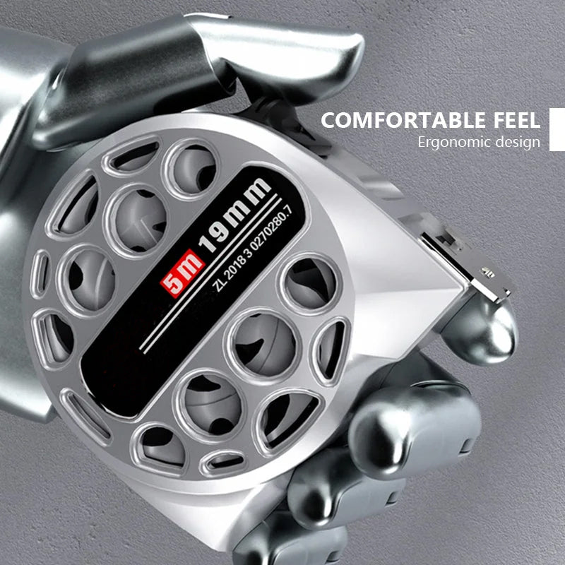 RUSTFRIE STÅLDELER: Dette målebåndet har sterke rustfrie stålkomponenter, som garanterer holdbarhet, korrosjonsmotstand og lang levetid. Den inkluderer rustfrie stålvalser og fjærer. Hele konstruksjonen er designet for å tåle støt og hindre rustdannelse.