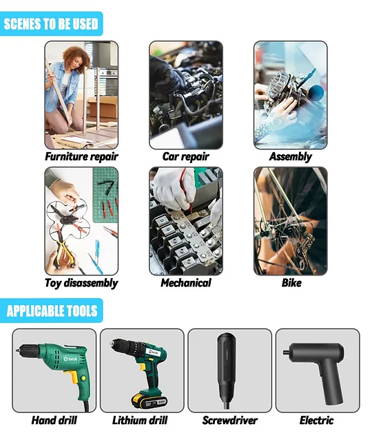 Skrutrekkere til borebruk er laget av S2-materiale, noe som gjør settet for elektriske borebits mer solid.