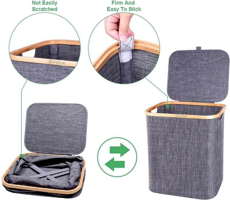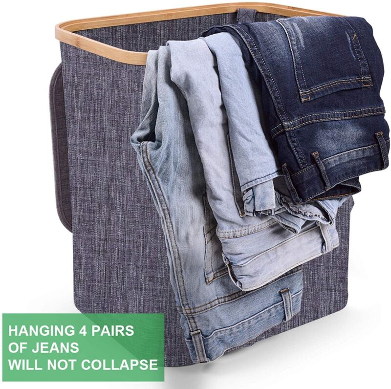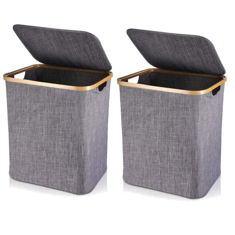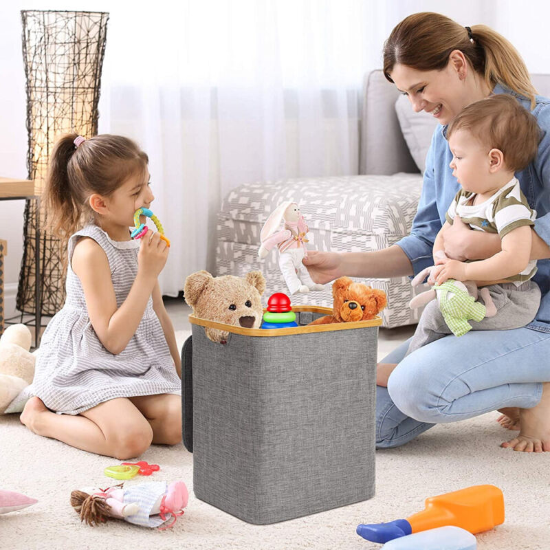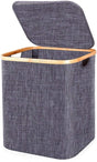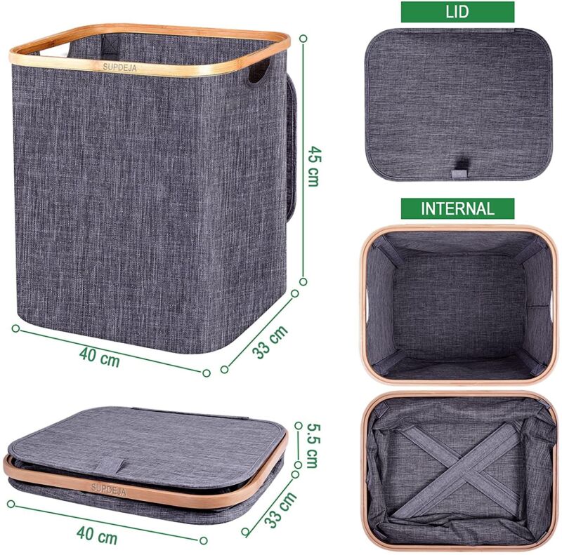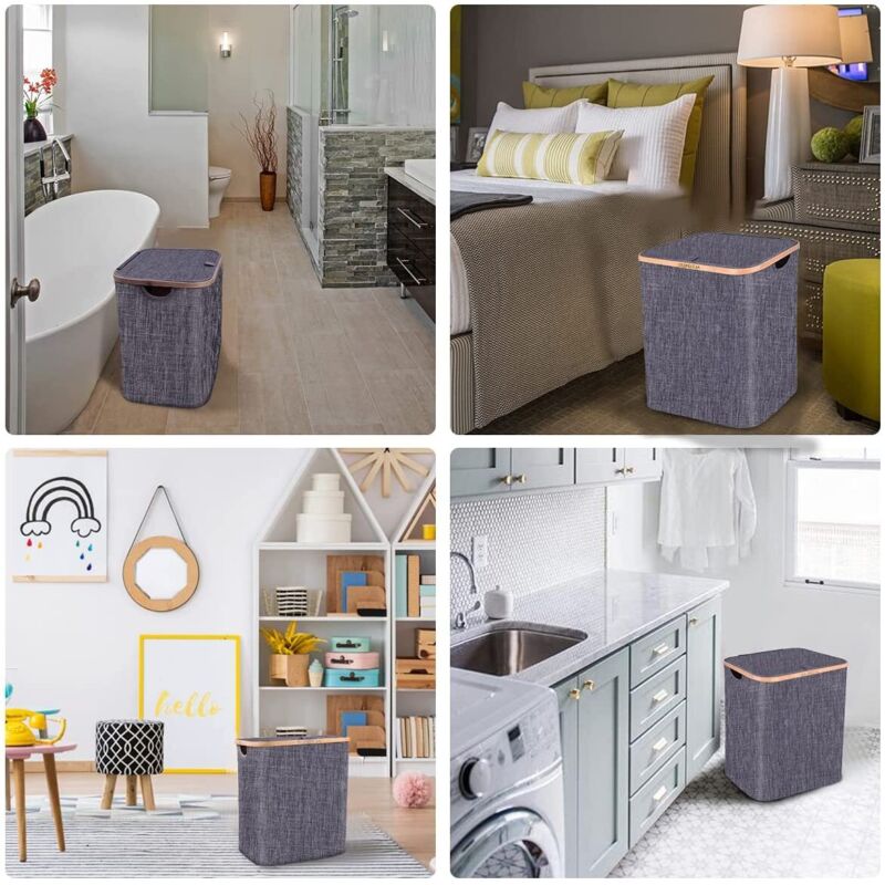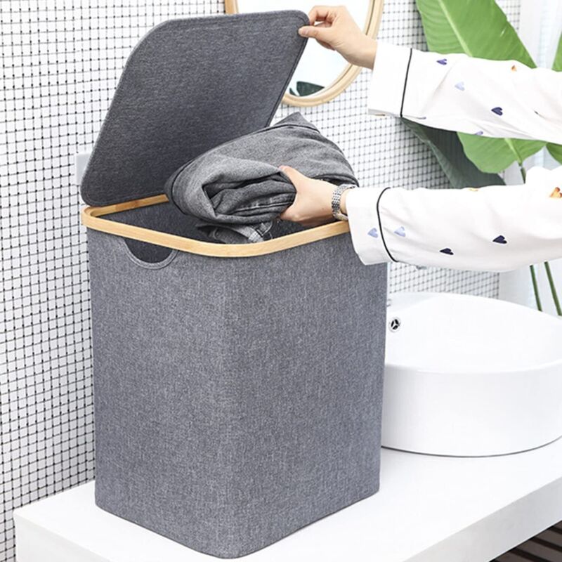 Hjemix | Kurv med lokk 60L, Vaskekurv med bambushåndtak og lokk, Sammenleggbar