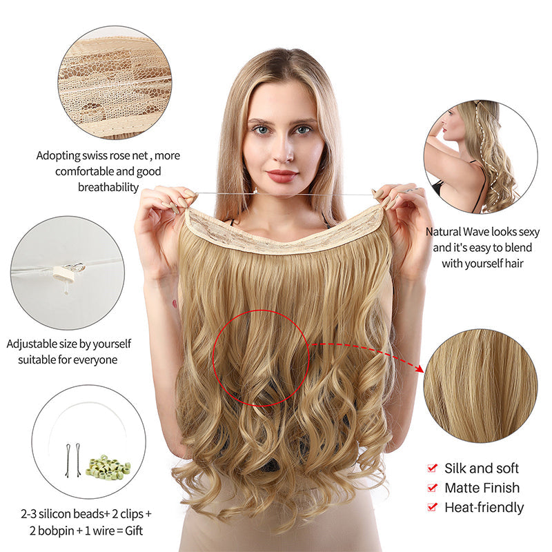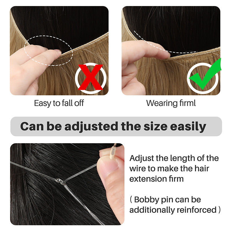 Den høykvalitets forlengelsen benytter en justerbar, nesten usynlig tråd som gir et komfortabelt og sikkert hold. Installeringen tar bare 60 sekunder, så du kan bruke dem både på klubben og på treningsstudioet - uten å dra i eller skade håret ditt og uten å miste ekstra sikkerhet fra clip-ins!