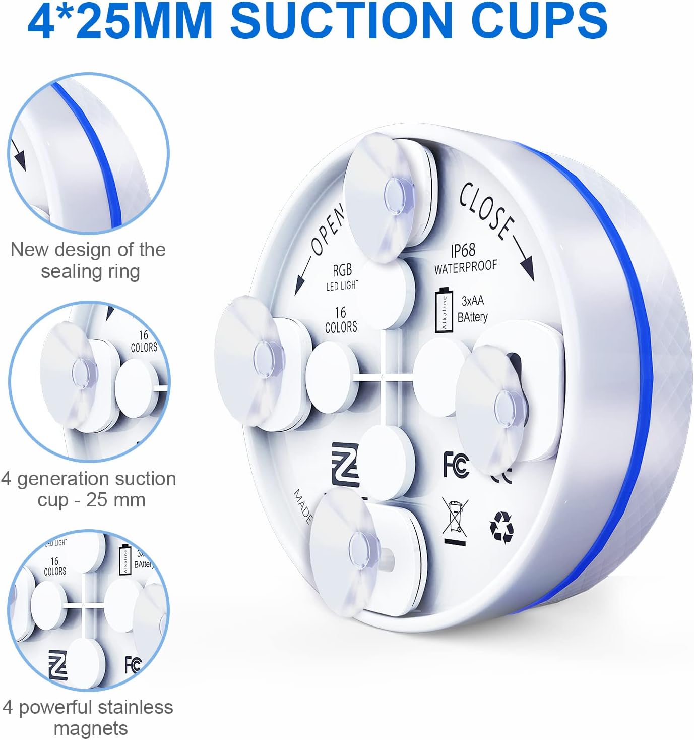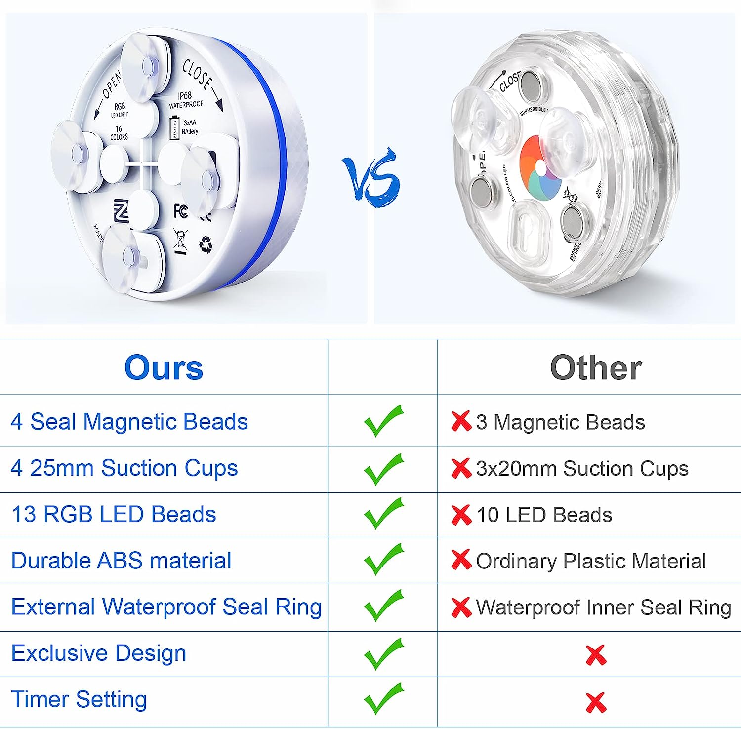 Forbedret lysstyrke med overlegen festeevne – Våre bassenglampene har blitt fullstendig oppgradert og inkluderer nå 4 kraftige forseglede magneter samt 4 holdbare silikon sugekopper som gir bedre feste enn mange andre produkter (noen tilbyr bare 2 PVC sugekopper og magneter). De fester seg solid til overflater ved hjelp av sugekopper og løser effektivt utfordringer knyttet til dårlig feste.
