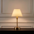 Denne lampen, med sin varme messingfinish og elegante kremfargede skjerm, løfter innredningen i ethvert rom, samtidig som den innebygde LED-pæren gir et mykt og innbydende lys.