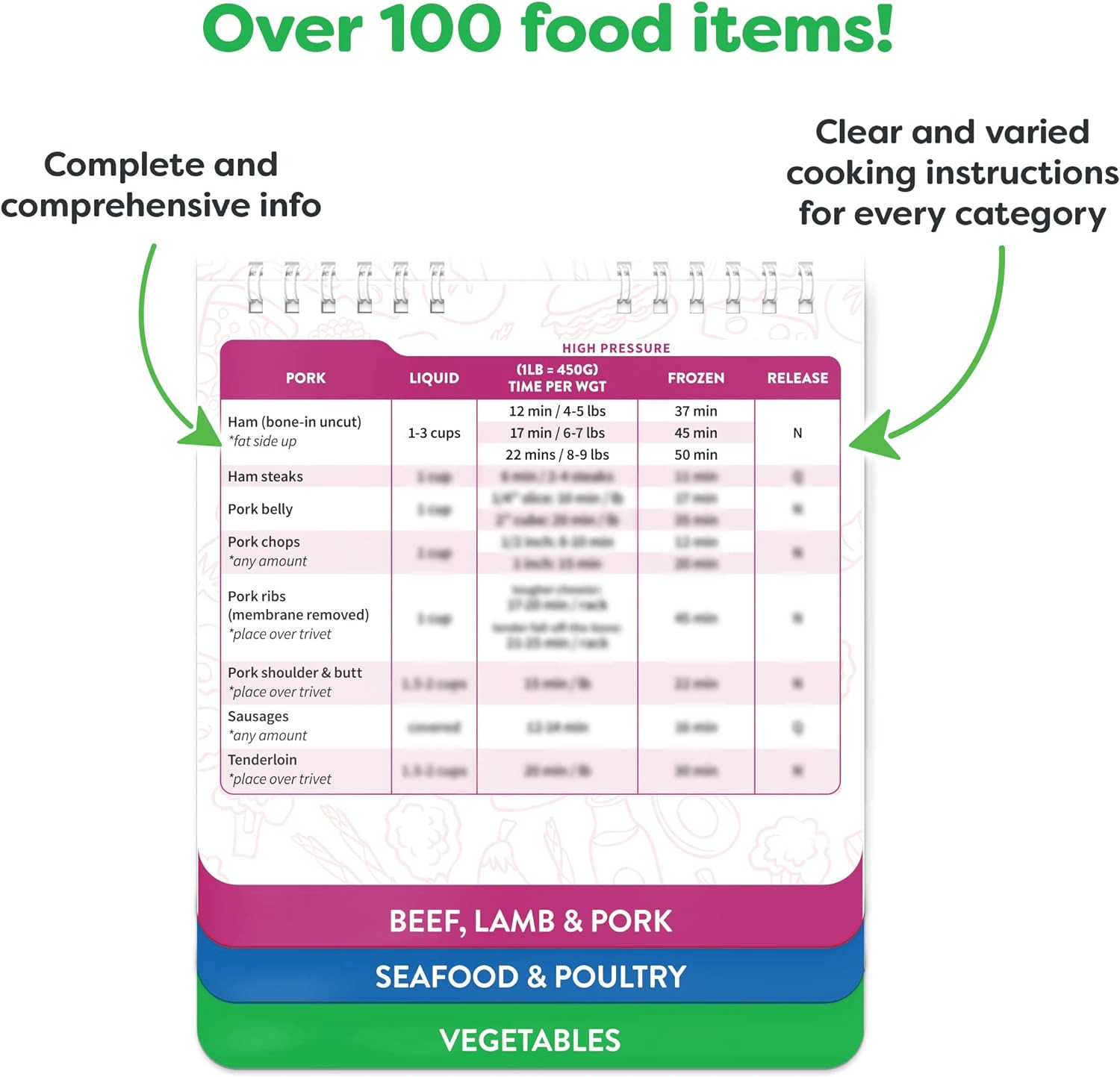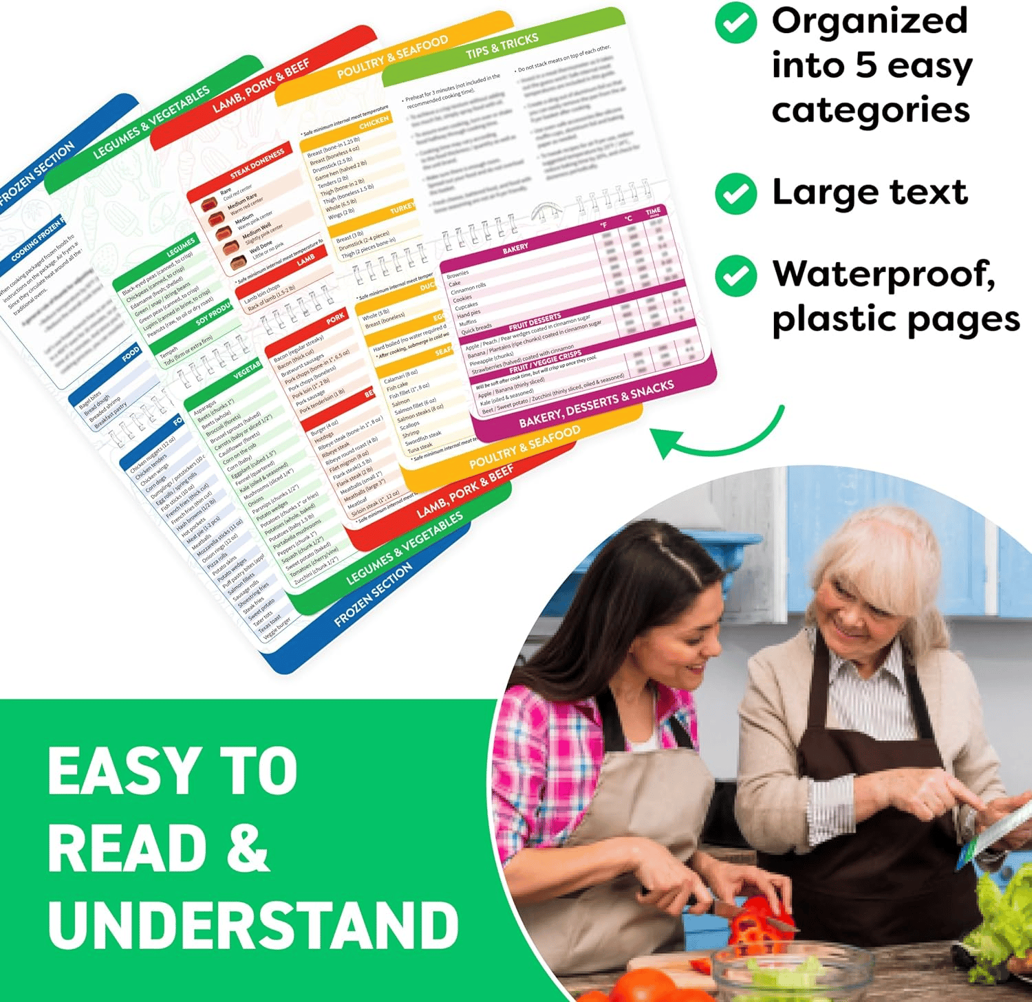 - Koketidsskjema i magnetisk format for luftfrityrkokere, en guide for tid og temperatur. Skreddersydde seksjoner som inkluderer: tips & triks, koketider for biff, minimum trygge indre temperaturer for kjøtt, en detaljert del for belgfrukter & grønnsaker for veganere, samt en egen kategori for bakverk, søtsaker & snacks.
