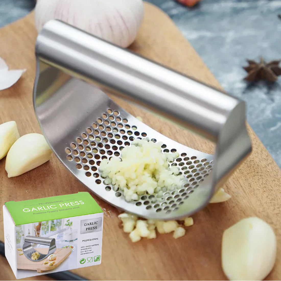- 1 * Manuell hvitløkpresse i rustfritt stål (emballert i eske)