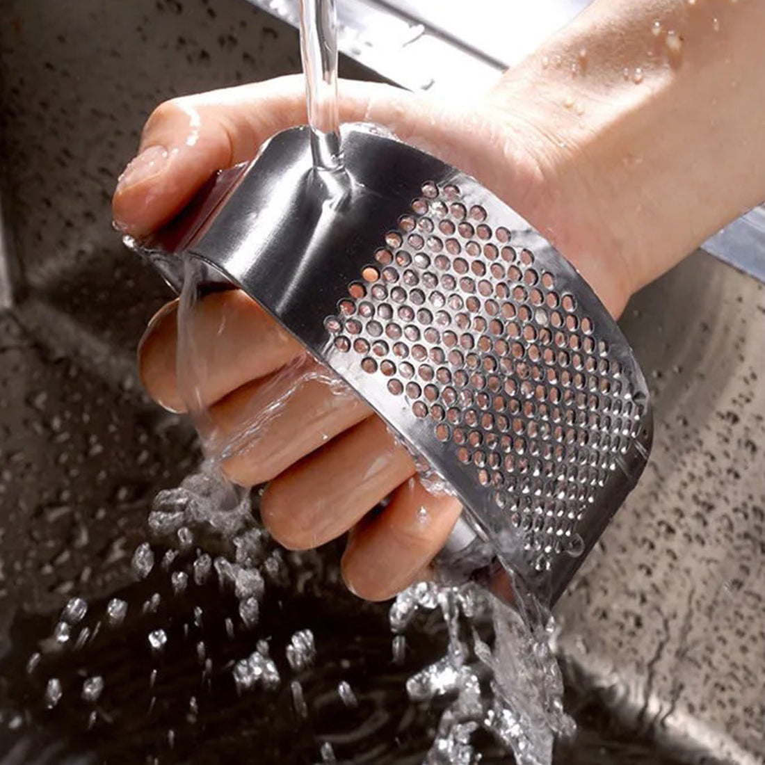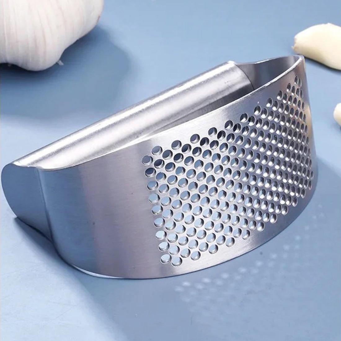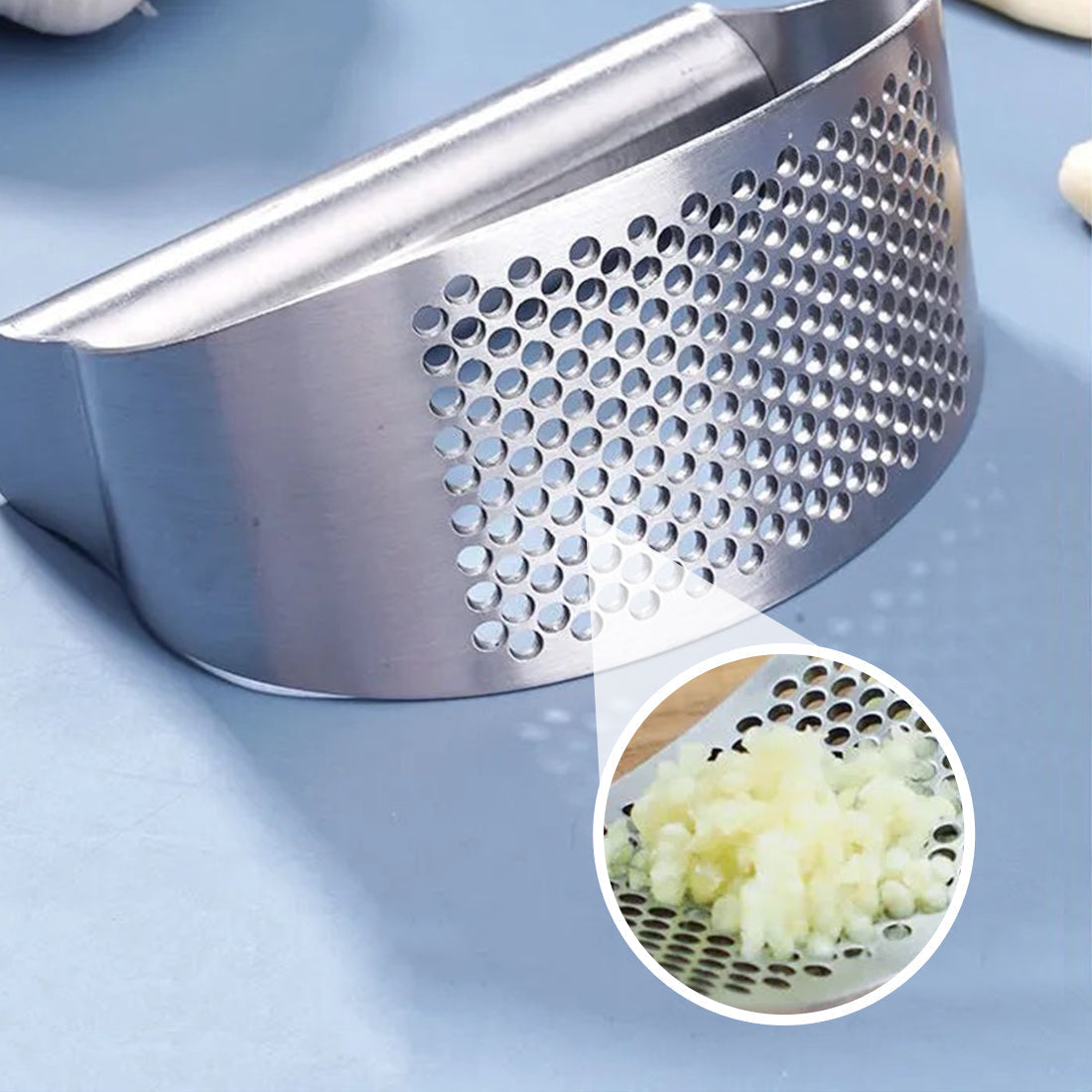 Knust hvitløk kan lett presses gjennom hullene for enkel tilsetning til supper.