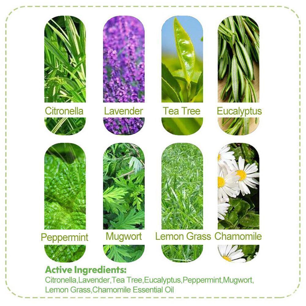 - Aktive ingredienser: Sitronella, lavendel, tea tree, eukalyptus, peppermynte, malurt, sitrongress, kamille essensiell olje
