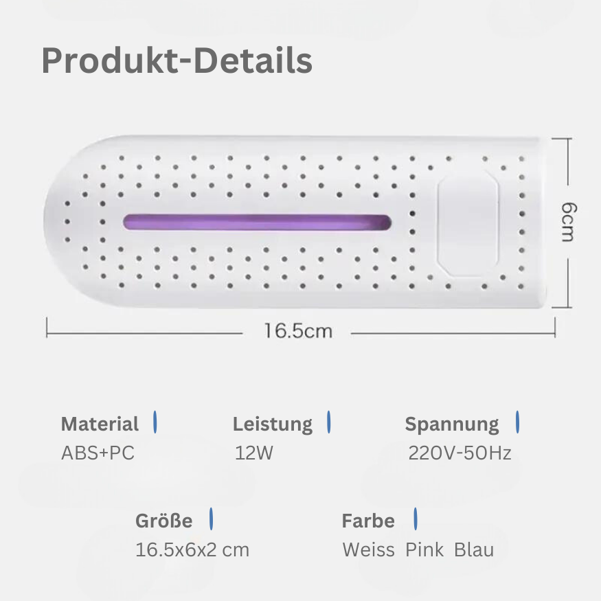 Ved å implementere avansert UV-desinfiseringsteknologi bekjemper vår enhet effektivt bakterier og sopp. Det kraftige UV-lyset desinfiserer og nøytraliserer ubehagelig lukt ved å eliminere opptil 99,9 % av skadelige mikrober. Dette sikrer at skoene dine både forblir tørre og er fri for luktfremkallende mikroorganismer.