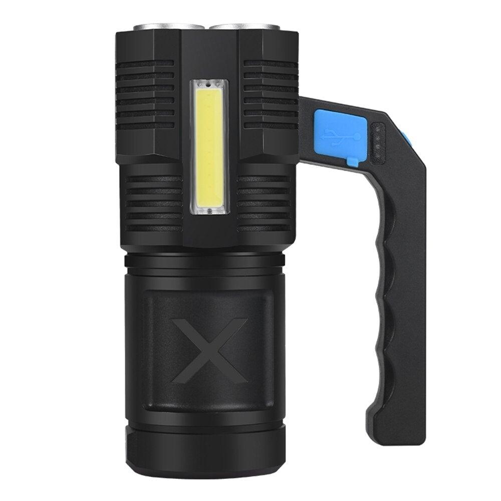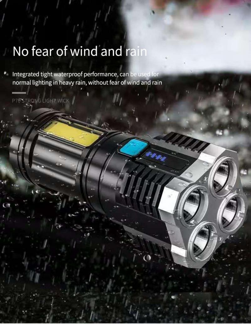 HOVEDFUNKSJONER: 4 ganger høyere lysstyrke, optimalt superlys. Hver lampe er utstyrt med 2 kjerner, noe som gir totalt 8 kjerner for lommelykten, og gir eksepsjonell ytelse i kampen mot mørket. Den kan være i drift i opptil 5 timer med full ladning. Batteriet er innebygd, noe som gir mulighet for lading når som helst du trenger, selv med lav strøm. Laget av slitesterk teknisk plast, er den både solid og lett.