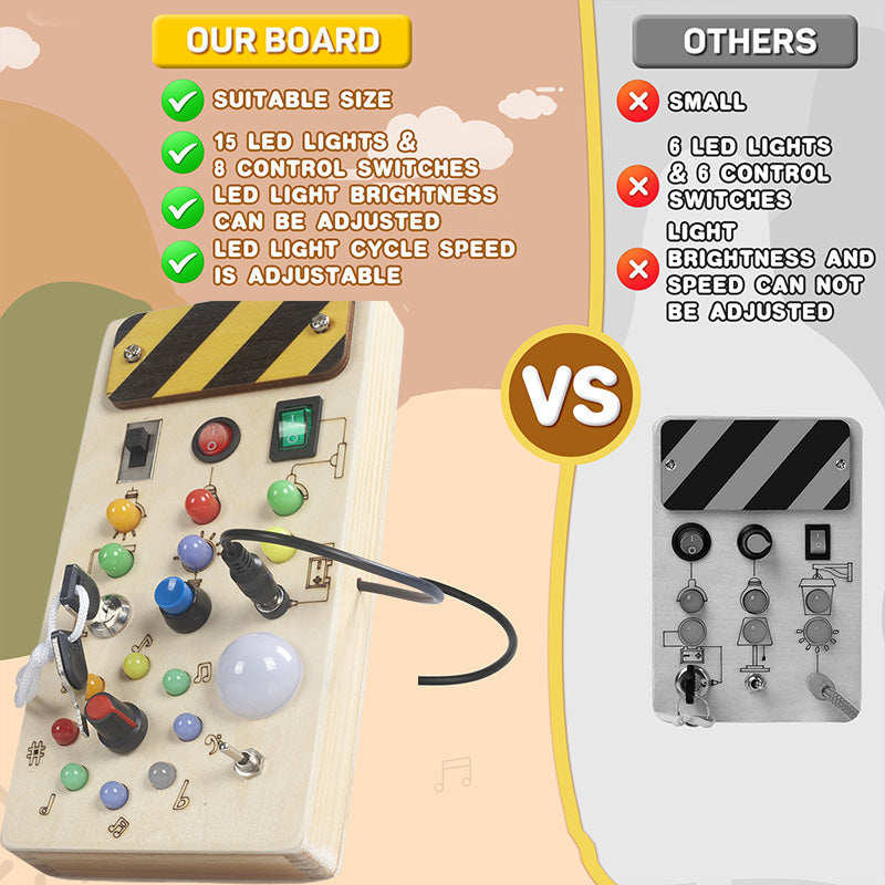 Produktet er laget for å aktivt engasjere småbarn i deres læringsprosess. Med en rekke knapper, skruer og LED-lamper, oppmuntrer det til utvikling av finmotorikk, fargegjenkjenning, og problemløsningsevner.
