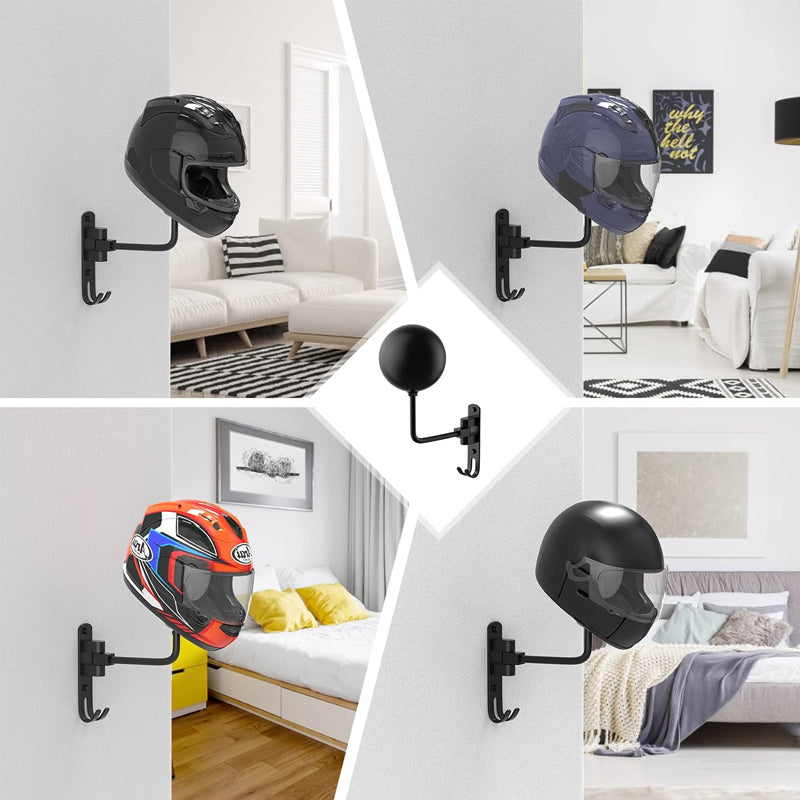 Du kan rotere denne hjelmhengeren 180° for optimal plassering. Juster vinkelen for å vise eller oppbevare hjelmen og andre ting, og når den ikke er i bruk, kan den enkelt brettes flatt mot veggen for å spare plass.