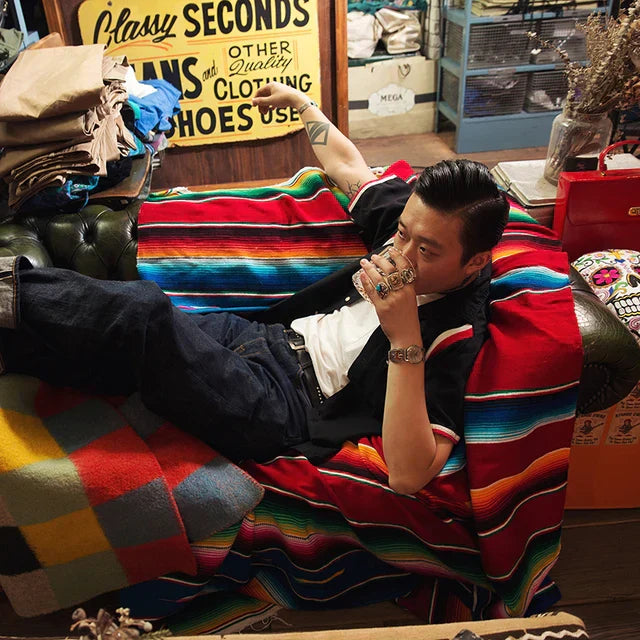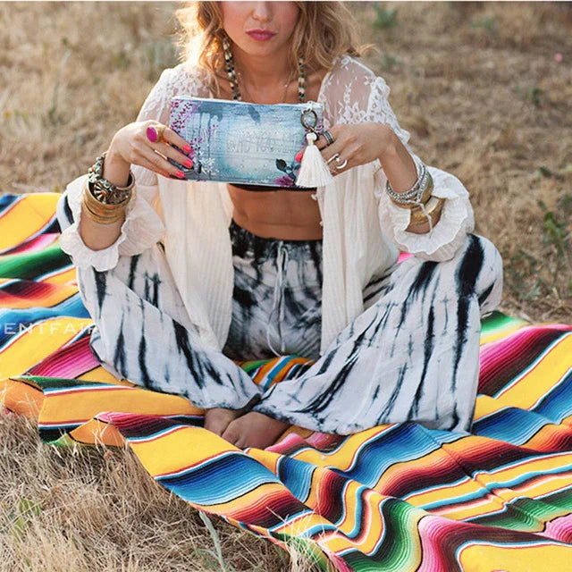Tilfør hjemmet ditt litt farge med dette livlige meksikanske Serape-teppet, som byr på dristige regnbue-striper i et klassisk og festlig design. Dette teppet er perfekt for å gi en fargeklatt til sengen eller sofaen din og skaper en inspirerende sørvestlig atmosfære i ethvert rom. Den lette vekten gjør det behagelig nok til å kose seg med, eller det kan fungere som et iøynefallende akseptstykke som stråler varme og glede.