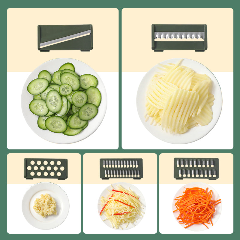 【9 i 1 Funksjonalitet】Denne grønnsakskjæreren leveres med 7 utskiftbare blader som gir forskjellige tykkelser for skjæring, rivning, og spiral skjæring. Bladene glir enkelt gjennom mange typer frukt og grønnsaker som paprika, poteter, tomater, løk, hvitløk, agurk, gulrøtter og rødbeter. Dette allsidige kjøkkenverktøyet forenkler matlagingsopplevelsen din betydelig.