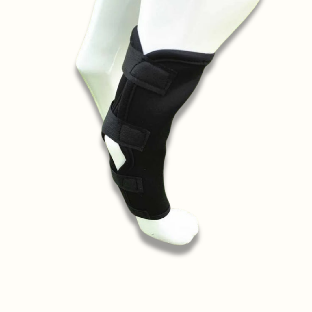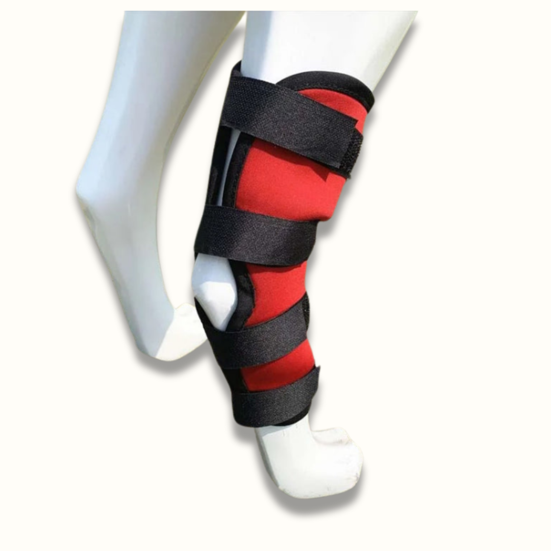 Die verstellbare Hundebeinstütze besteht aus einem stabilen Stützband mit Klettverschlüssen. Sie wird um das Hundebein gelegt und kann mit Riemen fixiert werden. Sichtbar sind gepolsterte Bereiche zur Umwicklung. Die Konstruktion ist gleichmäßig vernäht und mehrfach verstellbar.