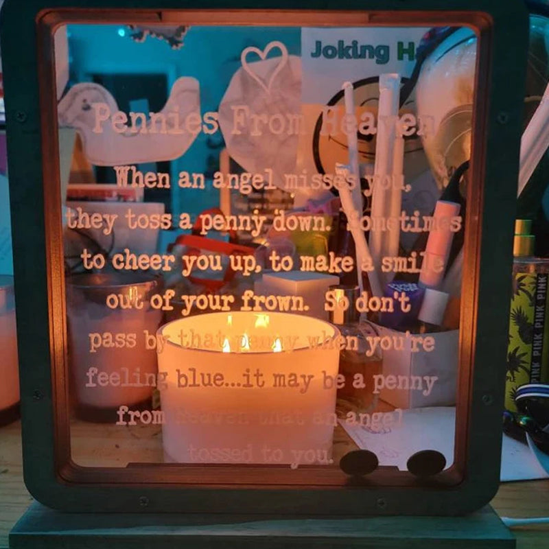 Vegghylle eller Bordstativ - Vår minnes sparer har en krok og et stativ på baksiden, slik at den kan benyttes både som vegg- og borddekor. Det klare, semi-forsterkede glasset i skyggeboksen inneholder inspirerende sitater, noe som gjør den helt spesiell.