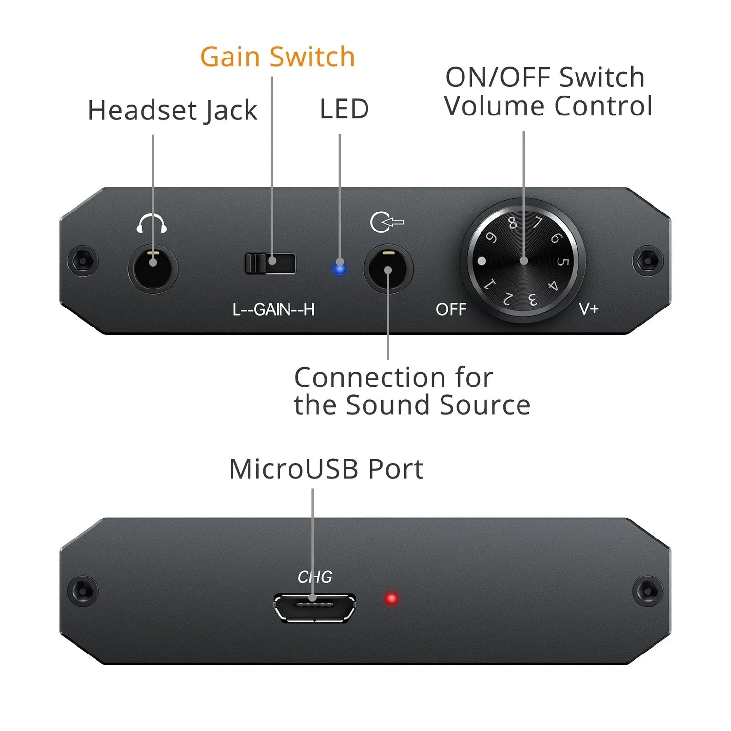 - HiFi hodetelefonforsterker, kompatibel med flertallet av hodetelefoner med høy impedans fra 16-300Ω, tilbyr en 3,5 mm AUX-inngang og -utgang, har et signal-til-støy-forhold på > 100dB, THD + N = 0.0003 %, effektivt filtrert forstyrrelser og gir muligheten til å nyte høykvalitetslyd.