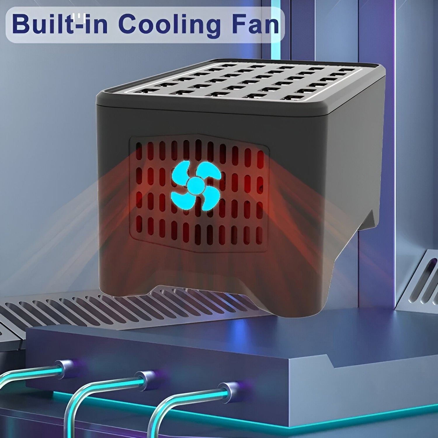 En innebygd viftemekanisme og en sklisikker underside garanterer jevn og sikker lading uten risiko for overoppheting.